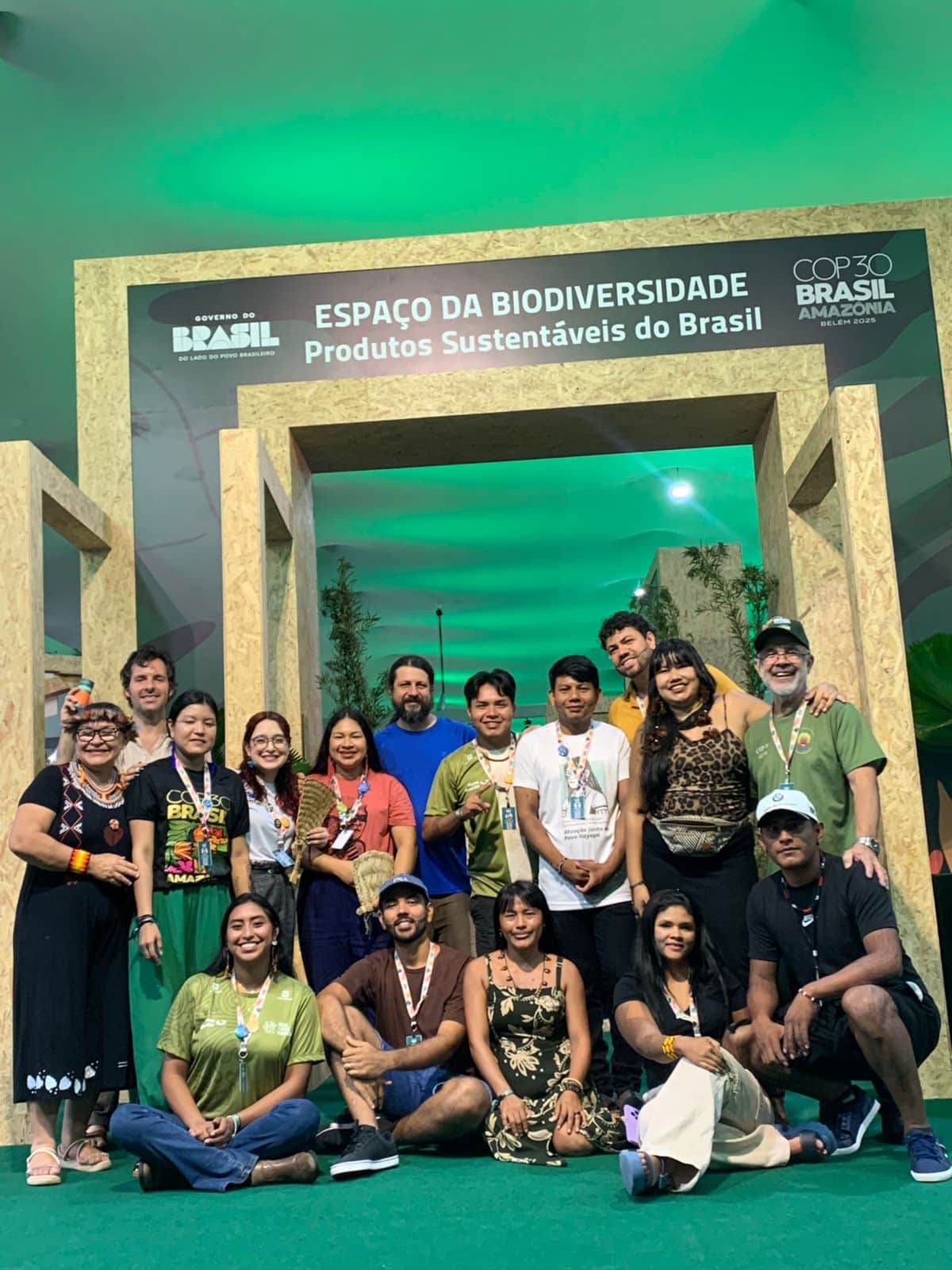 Notre participation à la COP30 s’est déroulée à différents niveaux : tout d’abord, à l’Aldeia COP, un espace dédié aux peuples autochtones et organisé par eux (5 000 représentants de 200 groupes ethniques s’y sont réunis pendant deux semaines) où nous avons pu exposer les produits des jardins forestiers des Sateré Mawé et de Guayapi. Ensuite, lors de la Marche pour le climat du Sommet des peuples qui s’est déroulée le 15 novembre. Enfin, lors de la COP30 officielle elle-même, dans la zone dite « verte », accessible au grand public, dans l’espace Biodiversité (Espaço Biodiversidade) qui fut géré par les organisations autochtones brésiliennes, le ministère des Peuples autochtones du Brésil (MPI) et la Fondation nationale brésilienne pour les peuples autochtones (FUNAI).
